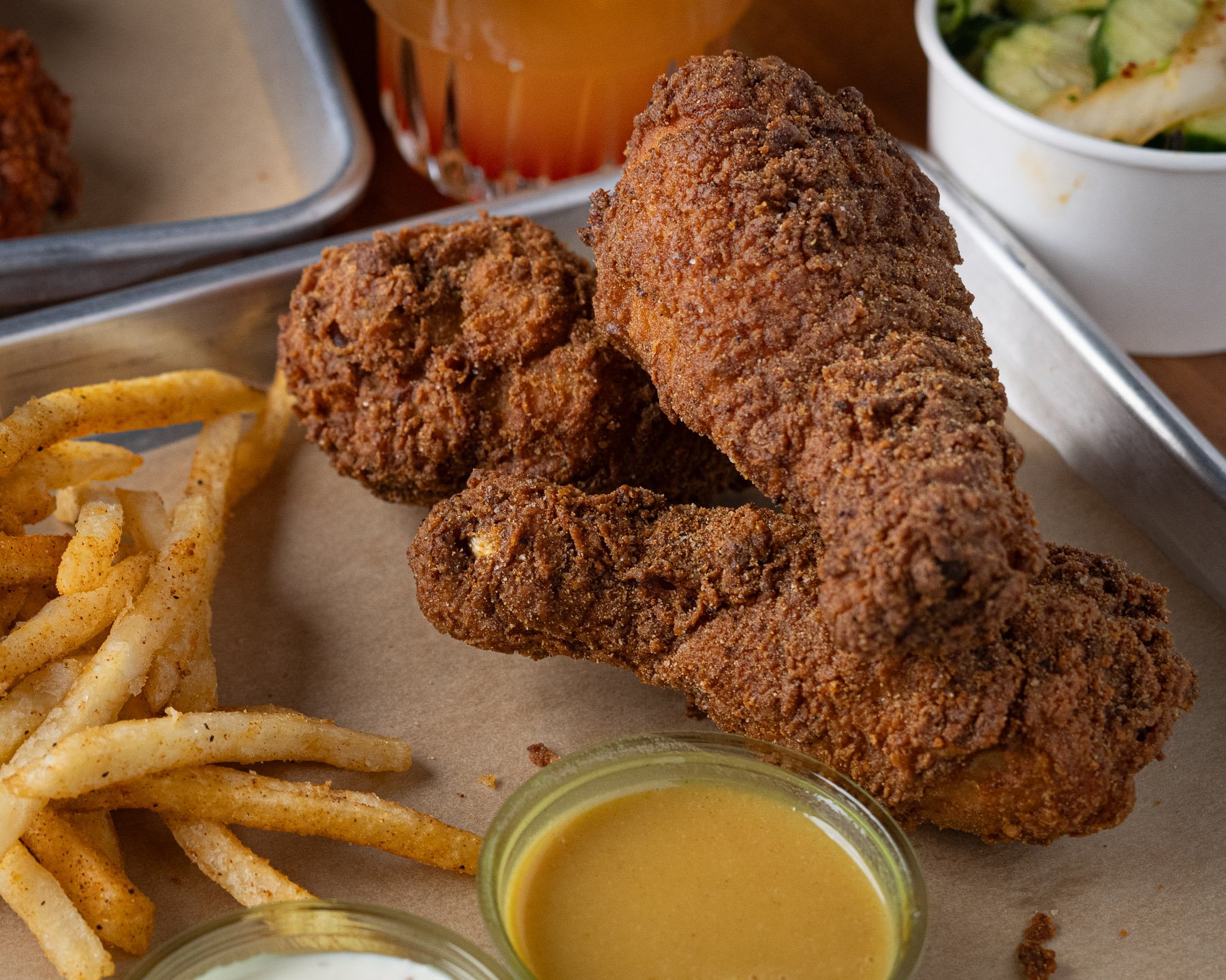 Three crispy fried chicken legs, served with a tangy side of daikon pickles. Your first dipping sauce is free but you should probably get more.